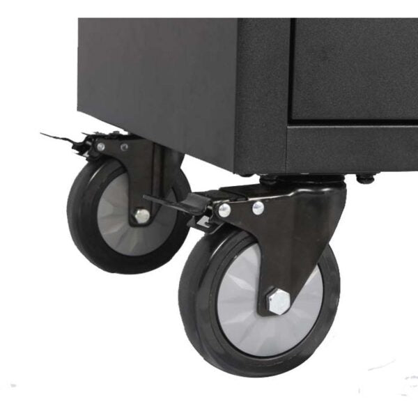 Thanks to the 5-inch high-performance wheels, with 2 brake-equipped and 2 fixed wheels, the trolley can be easily moved and remain securely in place during use. The sturdy black steel handle makes maneuvering the tool trolley effortless.