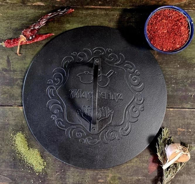 Prese Ø 35 cm, augstums - 9 cm, platums -0,9 mm čuguna apaļa Maysternya Svars 3,4 kg Ērts papildinājums čuguna virtuves piederumiem ir čuguna prese. Kāpēc jums ir nepieciešams preses vāks? Šādi vāki parasti nodrošina gaļas maigumu, sulīgumu, vienlaikus - ēstgribu rosinošu kraukšķīgu garoziņu, ļauj pagatavot daudz specifisku ēdienu. Apaļā versija ir ideāli piemērota apaļām cepšanas pannām vai pannām.